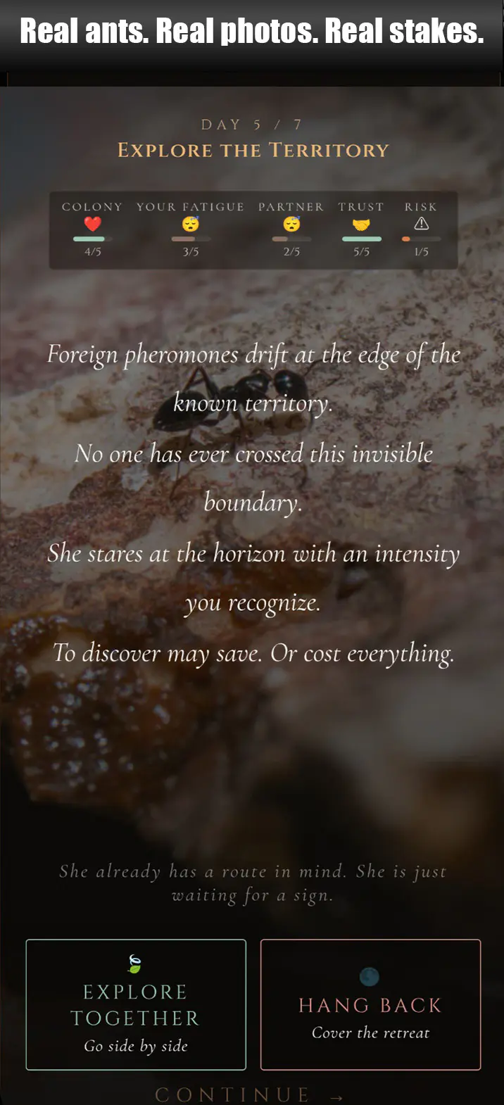 The photos in ANTagony were taken in the wild, over years spent photographing insects with a macro lens. I wanted each background to be a real encounter, a real ant, on a real leaf, in the real light of a spring morning. The grain of macro photography gives the game a documentary texture illustration cannot reproduce. The music is original, composed in GarageBand, dark, ambient, organic. Aside from the code, everything is handmade.