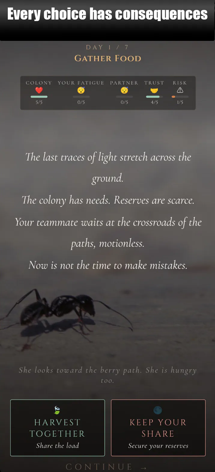 ANTagony's AI is not trying to defeat you. It is trying to find the best balance for the colony, exactly like you. It cooperates when it trusts you. It betrays when that trust has been broken too many times and cynicism has settled in. It forgives if you show enough consistency. It carries the memory of your previous runs, and if the last one ended with strong mutual trust, it begins the next slightly more open.The question the game ultimately raises is almost metaphysical: can you trust an intelligence that shares your objectives but whose intentions you can never fully read? Win alone now, or hold together longer. That question doesn't concern ants alone.