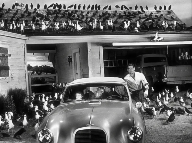 During filming, the production team worked with thousands of live birds including crows, ravens, gulls, and sparrows. The seagulls proved particularly unpredictable and aggressive, leading the crew to sometimes feed them wheat soaked in whisky to calm them down, as actor Rod Taylor recounted. While crows and ravens were easier to train and handle, the gulls remained difficult to control. Tippi Hedren described during an interview the shooting as “brutal, ugly and relentless,” particularly during the attic attack scene where live birds were thrown at her for several days, causing real injuries despite initial promises to use mechanical birds. This final attack scene took a week to shoot.